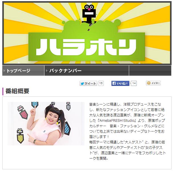 2015.09.10 9月11日放送 BS朝日「ハラホリ」に出演 ツイート 9月11日(金)深夜0:00~0:54放送#5 トークテーマ『キス』 『キス』をテーマにフカボリトーク!女の子ゲスト3人がファーストキスや一番良かったキスなど赤裸々に告白。 多くの夫婦やカップルの性に関するアドバイスや講演・執筆活動をするラブライフアドバイザーのOLIVIA先生を大人ゲストに迎え、「男の勘違いキス」や「上手なキスの仕方」「あなたの理想のキスシーンは?」など『キス』に関する様々なトークを展開。さらに、OLIVIA先生指導のもと男性も女性も使えるキステクニックを渡辺直美が実践! BS朝日 ハラホリ http://www.bs-asahi.co.jp/harahori/