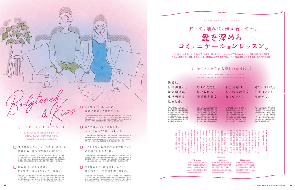 2022.08.10 8/10発売『anan 愛とSEX』コメント掲載 ツイート 夏の風物詩『anan』のSEX特集コミュニケーション・テクニックページにコメントが掲載されています。知って、触れて、伝え合って…。愛を深めるコミュニケーションレッスン。セックス前のマインドセット、ボディタッチ&キス、前戯、体位までコミュニケーション重視のtipsを紹介しました。他のページには漫画『働く細胞LADY』でわかる「性反応」「性的同意」対談大人のための「性教育」セルフプレジャーグッズなど最新の知識と情報がまんべんなく紹介されていて、読み応えあります。
